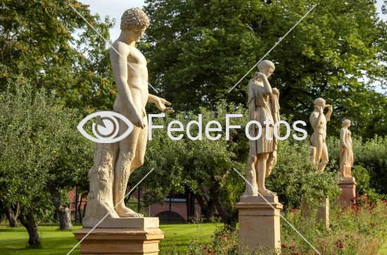 Carls Jacobsens Have. Statuer af terracotta (brændt ler) i italiensk have, Carl blev i øvrigt snydt ved købet, statuerne er falske. Vesterbro, København, Danmark. 2. august 2025. Nøgleord: J. C. Jakobsen park Carlsbergområdet carlsberggrunden carlsbergområde carlsbergbyen kunstværk skulptur statue private Carl Jacobsens havearkitektur havekunst haven haveskulptur havepynt på med Carlsberg-byen Carlsberg-området Carlsberg-kvarteret Carlsbergkvarteret Gamle det museumshaven museumshave museumspark museumsparken græsk græske kulturtilbud