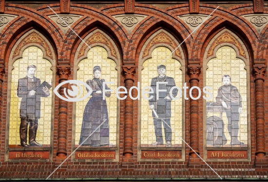 Del af Dipylontårnet på Carlsberg (tegnet af Vilhelm Dahlerup og opført 1892). Grundlægger Carl Jacobsen, familie (Ottilia, Alf) og arbejdere. Vesterbro, København, Danmark. 2. august 2025. Nøgleord: kakkel kakler Dipylon bryggeriet Carlsberg bryggeriarbejder bryggeriarbejdere bryggeriansat bryggeriansatte brygger Jacobsens copenhagen kunstværk genrefoto genre-foto illustrationsfoto illustrationsbillede illustrativt carlsberggrunden carlsbergbyen carlsbergområdet det gamle Carlsberg-byen Carlsberg-området Carlsberg-kvarteret Carlsbergkvarteret af fredet fredede ølbryggeri bryggeri bryghus kulturarv udsmykning ornamenter ornament ornamentering ornamentik gammeldags og ejendom ejendomme bygning port vartegn bue buet rundbue rundbuestil portal historisk industribygninger industribygning industriejendom industriarkitektur industri-arkitektur porten patina dekoration dekorationer dekoreret krummelurer detaljer på