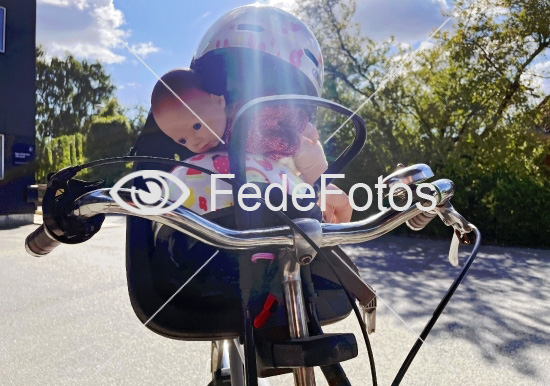 Cykel-sikkerhed. Cykelstol med dukke og to cykelhjelme. København, Danmark. 24. august 2025. Nøgleord: barn bagpå børnefamilie cykelhjelm færdselssikkerhed cyklist på styr på gade cykel sikkerhed cykling på cykel i trafikken cyklisme på cyklen cykeltur cykelture hjelm småbørnsfamilie små oppakning med børnecykelhjelm cykelkultur barnestol i barnesæde bag på cykelsæde sæde hjelm