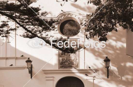 Katolsk kirke. Santa Domingo Church (Iglesia de Santa Domingo), Spain. Benalmadena Pueblo, Sydspanien, Spanien. 9. november 2007. Nøgleord: Benalmadena Sydspanien Sydeuropa spansk bygning kirken i sydeuropæisk sydeuropæiske sort hvid sorthvid sort-hvid sepia bruntonet bruntoning mosiak rundt vindue mønster stemningsbillede genrefoto genre-foto illustrationsfoto illustrationsbillede af illustrativt