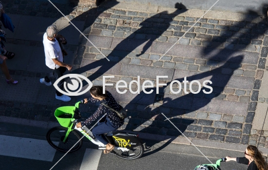 Mennesker på lejecykler. Fra Lime - Uber. Indre by. København, Danmark. 6. september 2025. Nøgleord: i aftenlys cyklist på cykel cykling cyklende cyklisme cyklen lejecykel bike cykelkultur cykeltrafik gade og sommerliv byliv vej folk gadebillede gadebilleder fortov skygge bybillede person personer i sommeraften om sommeren byferie storbyferie turister med på gaden sommerstemning stemningsbillede sommerferie ungdomsliv ungeliv storbyrejse budgetferie gademiljø rejse turist kvinde sommerferien gadebilledet en sommerdag trafikale trafikal trafikalt ferieliv fortovet bymiljø gadefoto pige sorgløs sorgløst sorgløshed sommertrafik ferietrafik dansk om aftenen aftentur storbysmart storbymenneske storbymennesker forbipasserende passerer ferien aftenstemning trafikant trafikanter byboer byboere cykelsti flere lejet udlejningscykel udlejningscykler turistcykel turistcykler feriegæst feriegæster mønster grafik grafisk abstrakt kunstfoto fotokunst fodgænger genrefoto genre-foto illustrationsfoto illustrationsbillede illustrativt storbyturisme gående lange