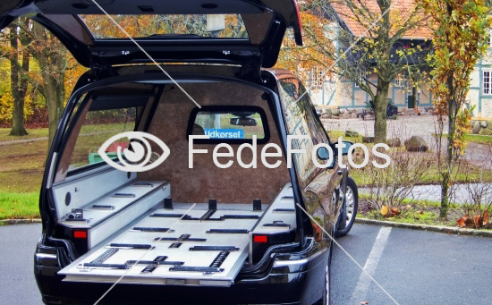 Ligvogn til begravelse. Udkørsel står der på et skilt gennem forruden. Hasseris Kirke og Svalegården, Aalborg, Danmark. 11. november 2014. Nøgleord: tradition og rustvogn ligvogne genrefoto genre-foto på i traditionel illustrationsfoto illustrationsbillede illustrativt tom klar den sidste rejse med åben klap trist tristhed sørgelig sørgeligt af bisættelse kistevogn rustvognskørsel