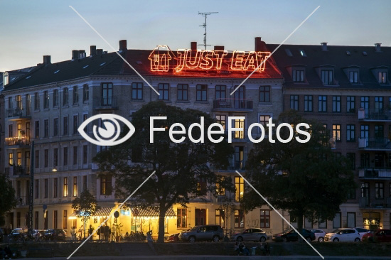Lysreklame - JustEat ved Søerne. København, Danmark. 6. september 2025. Nøgleord: cafe restaurant spejlbillede og reklamer spejling af i ved markedsføring af fx JustEat Just Eat JustEat-reklame JustEat-neonreklame JustEat-lysreklame lysreklamer neon neonreklame neonreklamer neonlys neonlysreklame neonlysreklamer neonskilt neonskilte neonskiltene lysskilt skilt stemningsbillede by night om natten copenhagen skiltning logo firmalogo virksomhedslogo firma virksomhed firmanavn virksomhedsnavn bygning nattefoto by oplyst med lys på marketing om aftenen reklamekampagne kampagne virksomheder over københavns tage tekst for ved nattetid nattetide lokkemiddel til nattestemning aftenstemning morgenstemning om morgenen genrefoto genre-foto illustrationsfoto illustrationsbillede illustrativt cafeliv om sommeren café udendørscafe udendørscafé udeservering fortovscafe om natten ved nattetid nattetide en sommeraften sommernat lysskilte reklameskilte reklameskilt reklamelys