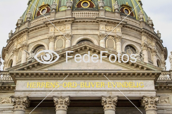 Marmorkirken (officielt Frederiks Kirke). Tekst: Herrens ord bliver evindelig. København, Danmark. 24. februar 2025. Nøgleord: guds ord evig evigt gud tårn kirke bygning af kirken over genrefoto genre-foto med rokoko rokoko-stil rokokostil tårnet på illustrationsfoto illustrationsbillede illustrativt rund kuppel søjler Frederiksstaden kirkekuppel marmor facade indgang indgangsparti seværdighed kuppeltag tambur i historisk facadeudsmykning