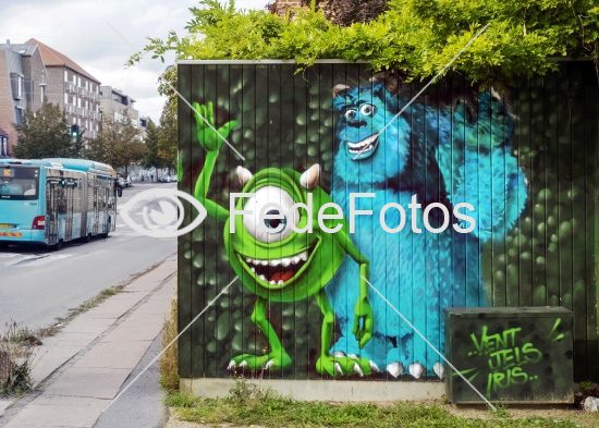 Mike og Sulley vinker. Monstre fra Monsters Inc. (fra Pixar). Kunstner-tag: Jels. Street art ved Irisvej og Frederikssundsvej. Husum, København, Danmark. 28. september 2025. Nøgleord: hilsen hilser glad glade monster graffitti plankeværk plankeværksmaleri malet på humor kuriøs kreativitet sjov opfindsom ide tegning fantasi idé copenhagen humoristisk mur maleri gavlmaleri murmaleri farverig sjovt figur tegneserie tegneseriefigur komisk kunstnerisk vægmaleri på graffitimur tegneseriehelt gademaleri gadekunst kreativ kreativt fantasifuld husgavlmaleri husgavlsmaleri husgavl gavl graffitikunst kunstværk sjove grafittivæg grafittivæggen væg farverigt værk gadepoesi streetart street-art spraglet spraglede kuriøst anderledes malerkunst pangfarve fantasifuldt urbanart urban-art i pangfarver multifarvet mangefarvet børnemaleri farvestrålende kulørt kunstnertag kunstner-tag tags gys uhyggelig skræk vanskabning uhyggeligt kun et øje pels energisk energiske anderledes utraditionel utraditionelt fantasiunivers fantasy syret underlig underligt speciel graffiti-tag graffiti-tags spøjs spøjst pudsig
