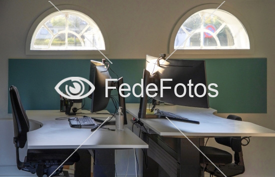 PC-arbejdsplads. Danmark. 13. august 2025. Nøgleord: arbejdsplads på arbejdspladsen skrivebord skriveborde kontor kontorfællesskab arbejde virksomhed kontorarbejde erhvervslivet business skærmarbejde kontorarbejder kontormiljø på kontoret kontorlokale kontorlokaler computerskærm skærm it-udstyr itudstyr pc pc'ere pc-er pc-ere arbejdsmarked arbejdsmarkedet genrefoto genre-foto illustrationsfoto illustrationsbillede af illustrativt vindue vinduesplads halvbue buet bue ladevindue med buet buer vinduesbuer vinduesbue murstensbue orden computer-arbejdsplads arbejdsstation pcere arbejdsstationer kontor-ansat kontor-medarbejder kontor-job kontoransat kontormedarbejder kontorjob