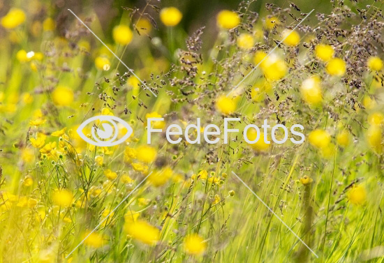 Smørblomster: Gule knold ranunkler (Ranunculus bulbosus). Samsø, Danmark. 31. maj 2025. Nøgleord: Ranunkel (Ranunculaceae) buttercups knölsmörblomma knollsoleie smørblomst buttercup græsstrå gult blomster eng engblomster blomstereng blomsterhav mark med blomstermark vilde blomster sommerblomster om sommeren selvsået selvsåede naturgrund blomstertæppe mange blomsterdækket blomsterdække plante blomsterpragt uskarp uskarpt selektiv lille dybdeskarphed genrefoto genre-foto illustrationsfoto illustrationsbillede illustrativt