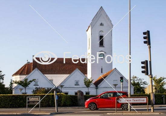 Taastrup Nykirke. Fra 1907 og bygget i norditaliensk stil. Taastrup, København, Danmark. 13. august 2025. Nøgleord: hvid kirke landsbykirke seværdighed turistmål bygning hvidt hvidmalet kirken i på genrefoto genre-foto illustrationsfoto illustrationsbillede illustrativt af klassisk dansk Høje-Taastrup italiensk vej bil trafik Tåstrup kirketårn